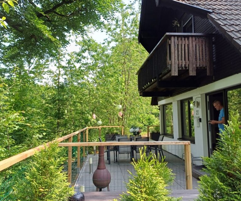 Het gezellige huisje maakt onderdeel uit van het vakantiedorp Frankenau en ligt op een berghelling en tegen het Kellerwald (bos) aan. Er zijn geen faciliteiten in het vakantiedorp, pure rust en natuur. Het huisje heeft een omheinde tuin, die volledig is omheind met een 1.20 meter hoog gaashekwerk. Zo kunnen honden & kinderen veilig spelen. Het terras is middels een poort apart af te sluiten van de tuin. Het terras nodigt uit tot een gezellig drankje, BBQ, of lekker dagdromen met uitzicht op een groene oase van bomen en heeft veel privacy.